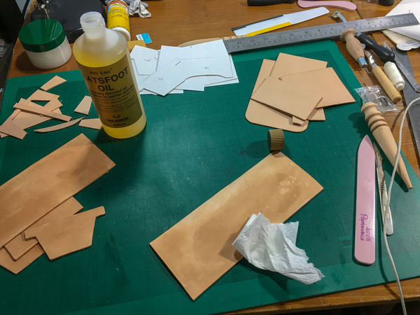 The first step was to draw out some template shapes on illustrator and print them on to card. Once these were cut they could be used as templates for cutting the leather. All the shapes were then bevelled and burnished on the edges and treated with oil.